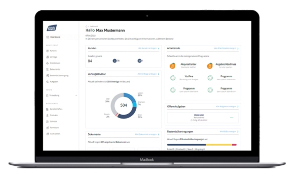 Der zentrale Zugangspunkt zur Allumfassenden Maklerplattform ist das Maklerverwaltungsprogramm (MVP) Professional works. Schon heute kannst du mit Professional works weitgehend digital arbeiten, weil Kunden- und Vertragsdaten sowie Dokumente vollautomatisiert angelegt und gepflegt werden – von der ersten Kontaktaufnahme über den gesamten Beratungsprozess bis hin zur Vertragsunterzeichnung.