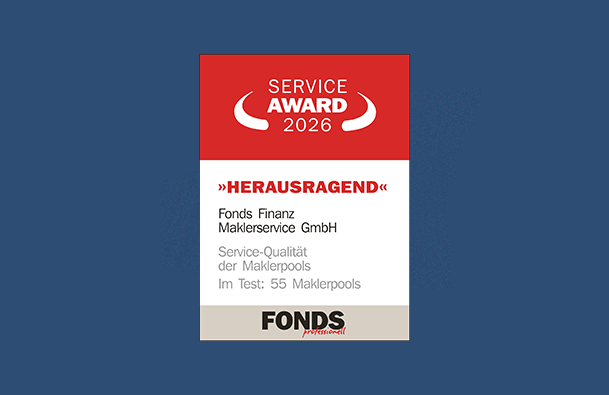 Die Fonds Finanz wurde beim diesjährigen FONDS professionell KONGRESS in Mannheim bereits zum 16. Mal mit dem renommierten Service Award ausgezeichnet. In der Kategorie „Service-Qualität der Maklerpools“ haben wir erneut das Prädikat „Herausragend“ erhalten – ein starkes Zeichen für Verlässlichkeit, Kompetenz und exzellenten Service.